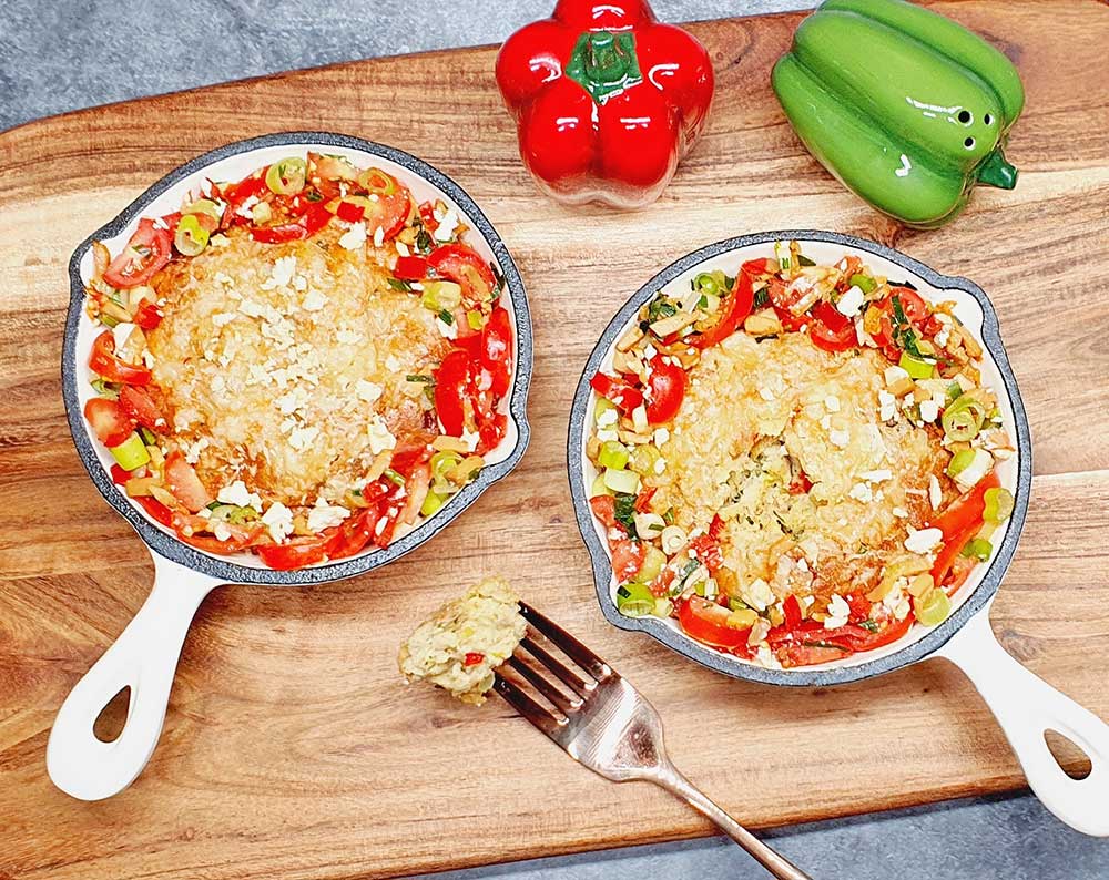 Die Pfannenpancake aus dem Ofen nehmen und etwas abkühlen lassen. Den Salat am Rand verteilen und sich lauwarm schmecken lassen.
