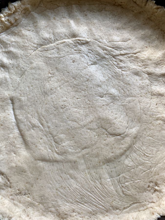 Den Teig in die Form drücken und Rand etwas hoch ziehen - geht mit feuchten Händen wunderbar.