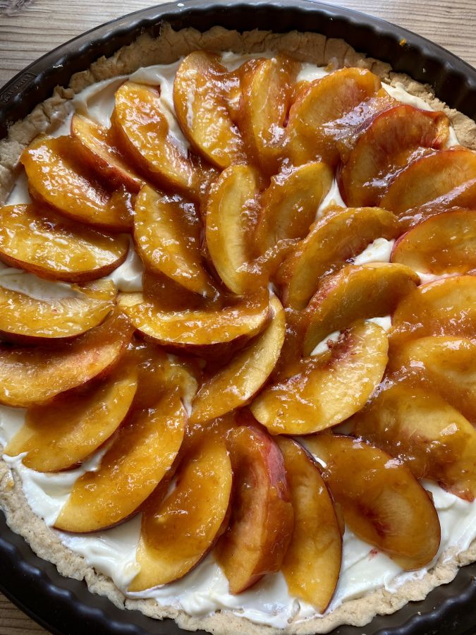 Die Marmelade mit etwas Wasser (1-2 EL) verrühren und erwärmen (Mikrowelle oder Topf). Auf den Pfirsichen gleichmäßig verteilen.