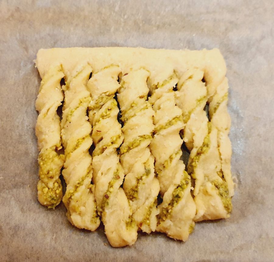In die Batzenform setzen. Mit Ei bestreichen und mit Pistazien bestreuen.