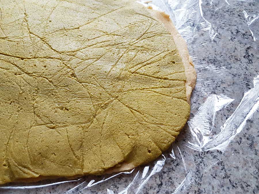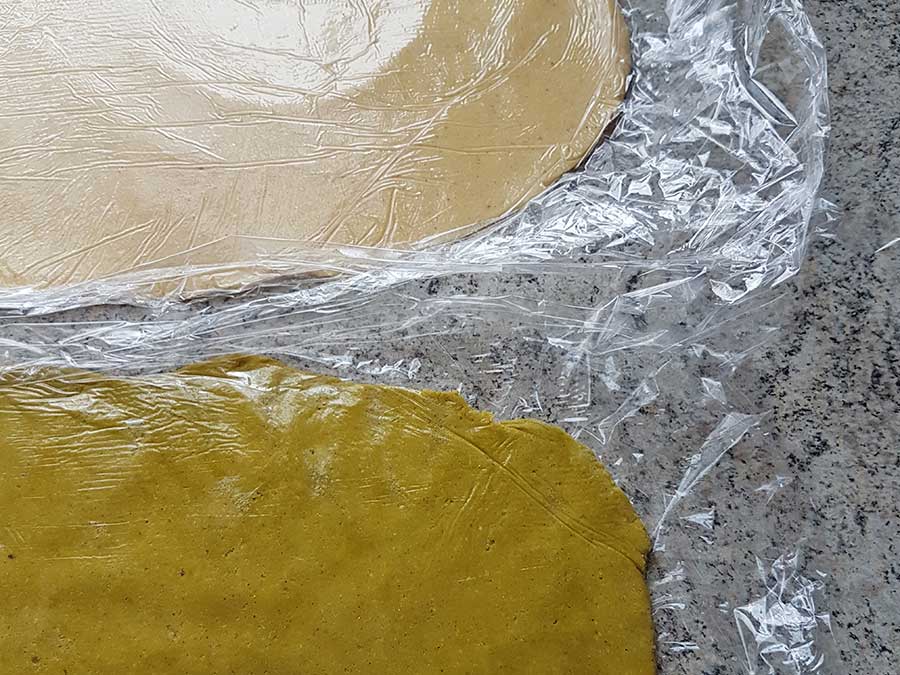 Beide Teige zwischen zwei Lagen Frischhaltefolie auf ungefähr die gleiche Größe (ca. 15 x 30 cm) ausrollen. Die Lage Pistazienteig auf den hellen legen und von den langen Seite her aufrollen. Mit Frischhaltefolie umwickelt ca. 1 Stunde kalt stellen.