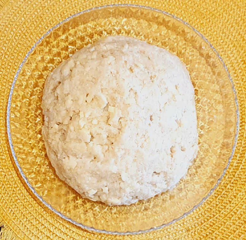 Pizzateig und Bambusfaser in einer Schüssel miteinander vermischen, Gouda und Salz hinzufügen, alles einmal durchrühren. Das Wasser aufgießen und unter Rühren einen Teig zubereiten. Teig für 20 Minuten ruhen lassen.