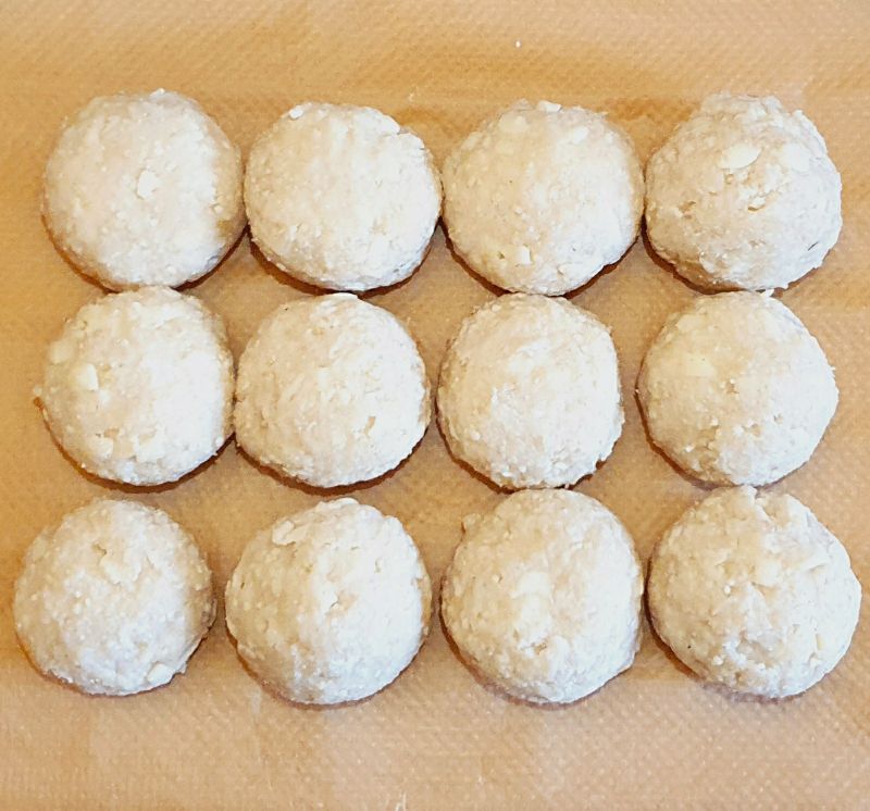 Nach dem Ruhen des Teiges den Teig in 12 gleich große Teile teilen und Kugeln drehen. Ein Teil hat ca. 55g.