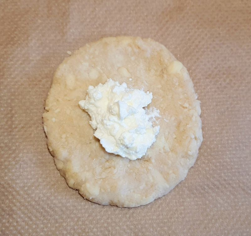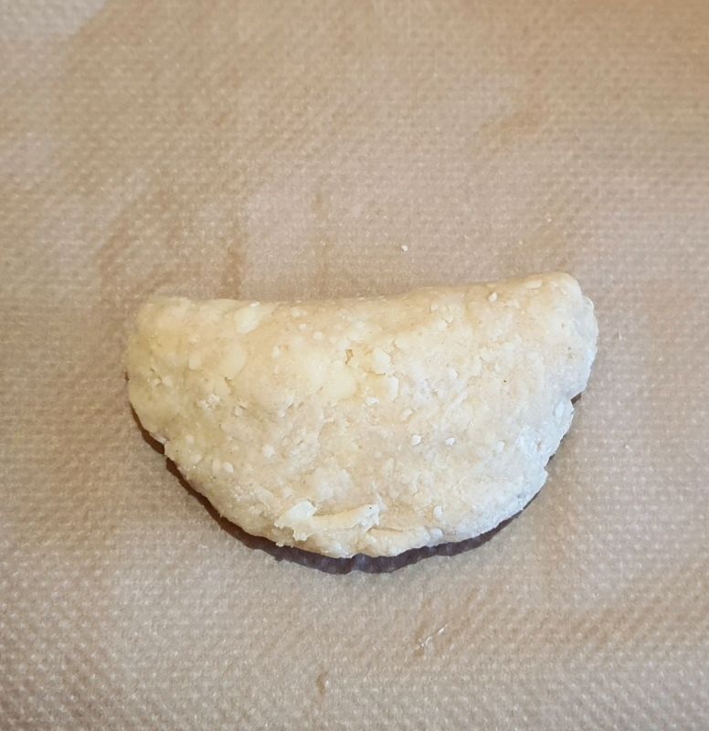 Den Teig umklappen und den Halbkreis an den Rändern links und rechts zusammendrücken.