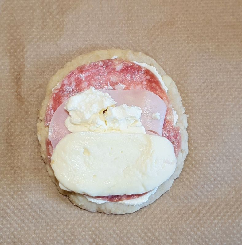Darauf einen Klecks Frischkäse und auf der unteren Rundung die MozZarellascheibe legen.
