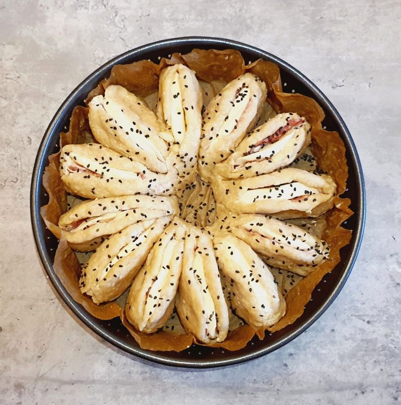 Die Halbkreise mit der Öffnung nach oben in Form einer Blume in die Backform legen. In der Mitte mit feuchtem Finger den Teig glatt streichen so dass ein gleichmäßiger Kreis entsteht. Mit Gewürzen und Sesam bestreuen.