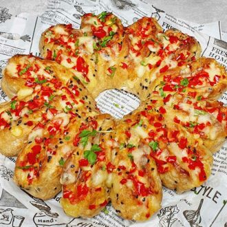 Nach der Backzeit von 40 Minuten die Pizzablume aus dem Backofen holen, kurz ein paar Minuten abkühlen lassen und mit der Tomaten - Paprika - Käse Mischung bestreuen.