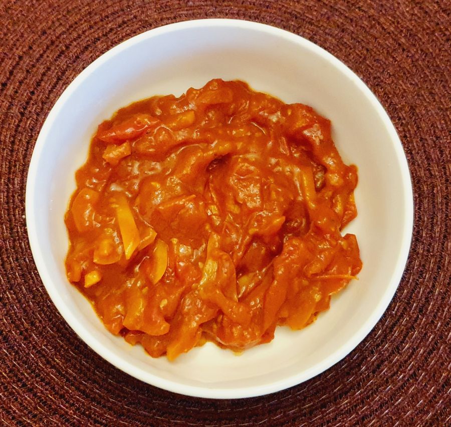 In einer Pfanne Ghee und Karamelltraum schmelzen, Tomaten und Paprika scharf anbraten. Tomatenmark, Salz und Gemüseliebling hinzufügen, durchrühren und mit Wasser aufgießen. Einköcheln lassen bis es dick und cremig ist. Dann von der Flamme nehmen und etwas abkühlen lassen.