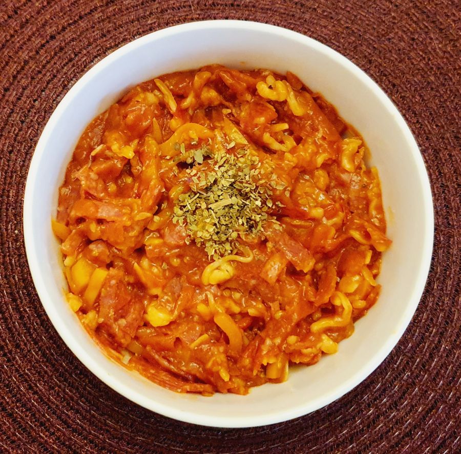 Salami in dünne Streifen schneiden, Käse reiben und mit der Tomaten Paprikamischung, Pizza Pizza Gewürz vermengen. Abschmecken ob genug gewürzt, evtl. nachwürzen.
