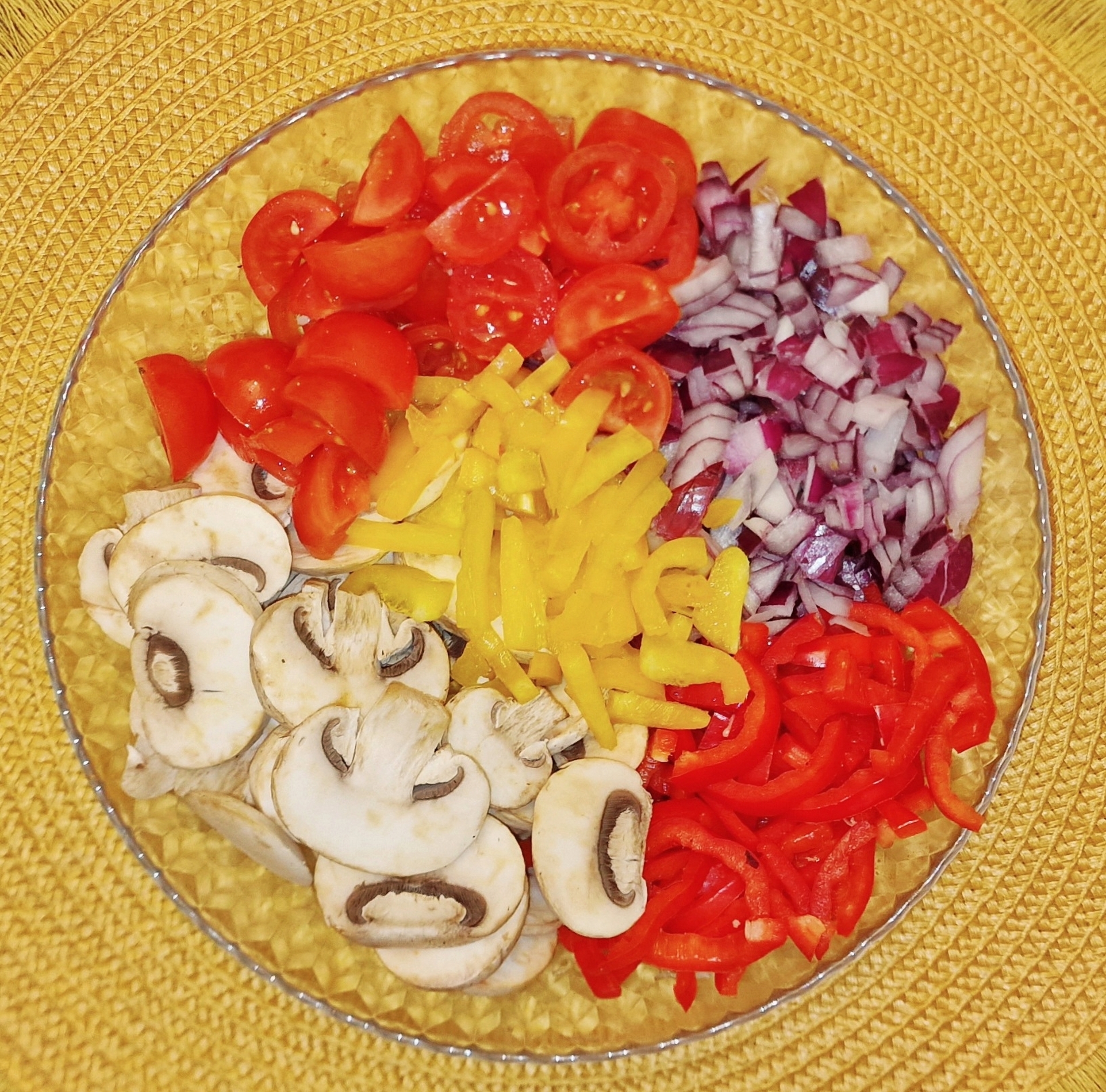 Zwiebel, Paprika klein würfeln, Champignons in Scheiben schneiden, Knoblauch pressen, Tomaten vierteln.