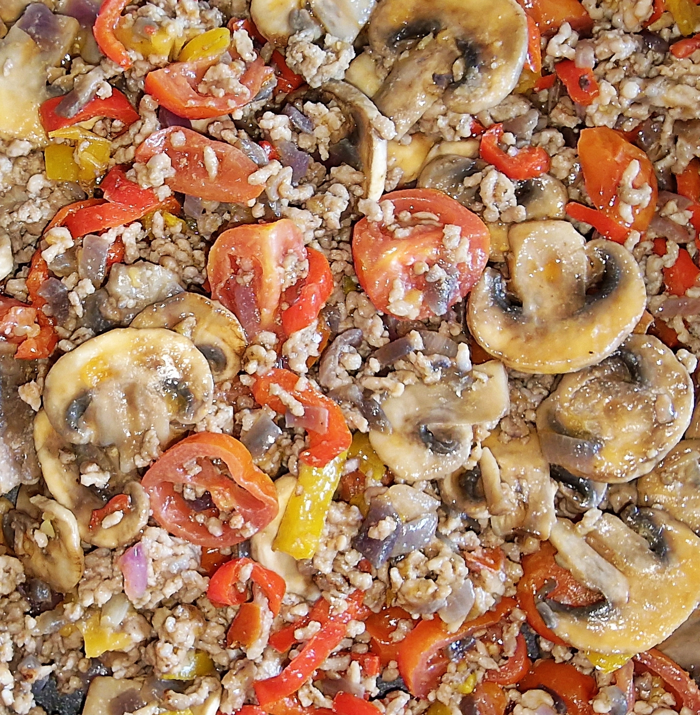 In einem Topf Butterschmalz erhitzen, Zwiebel und Knoblauch leicht anbraten, Hackfleisch, Gemüseliebling und Hackfleischliebling hinzufügen und mit anbraten, dann Paprika und Champignons hinzufügen, fertig braten.