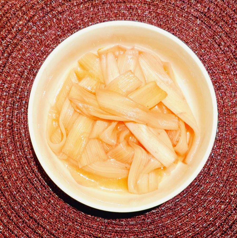 Rhabarber putzen in ca. 20 cm lange Stücke schneiden, dann der längs nach dünn abschneiden.