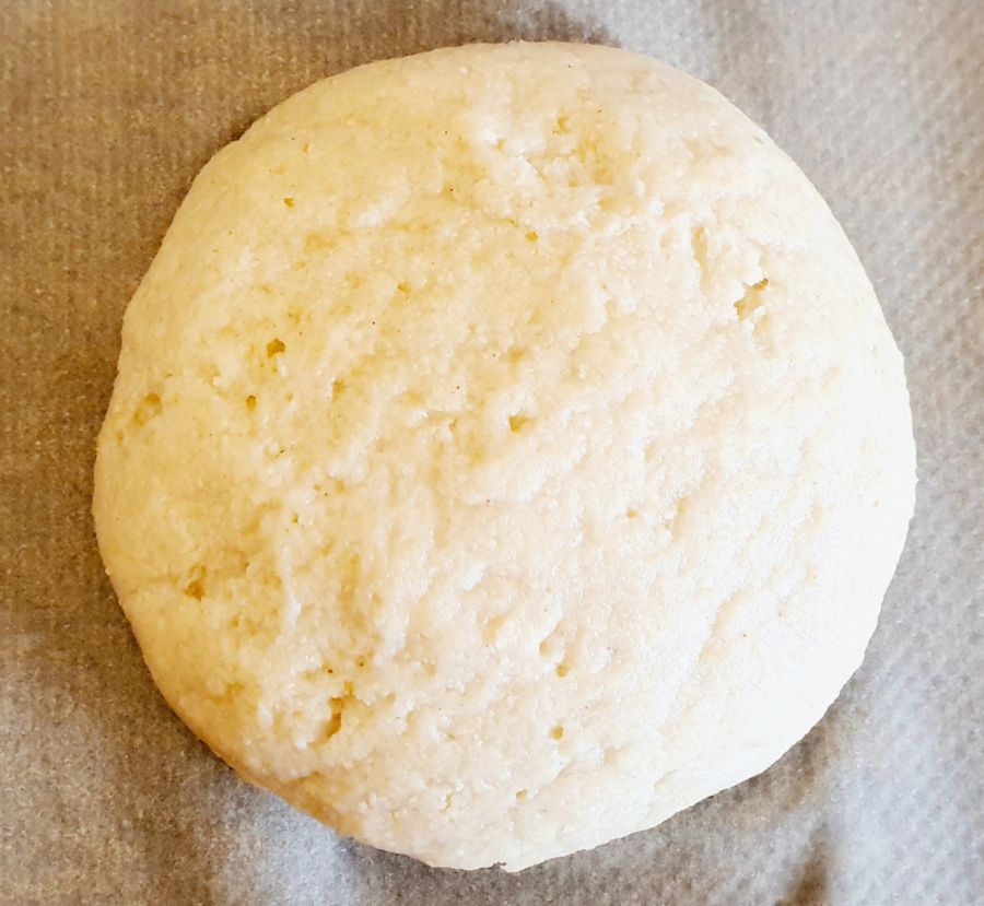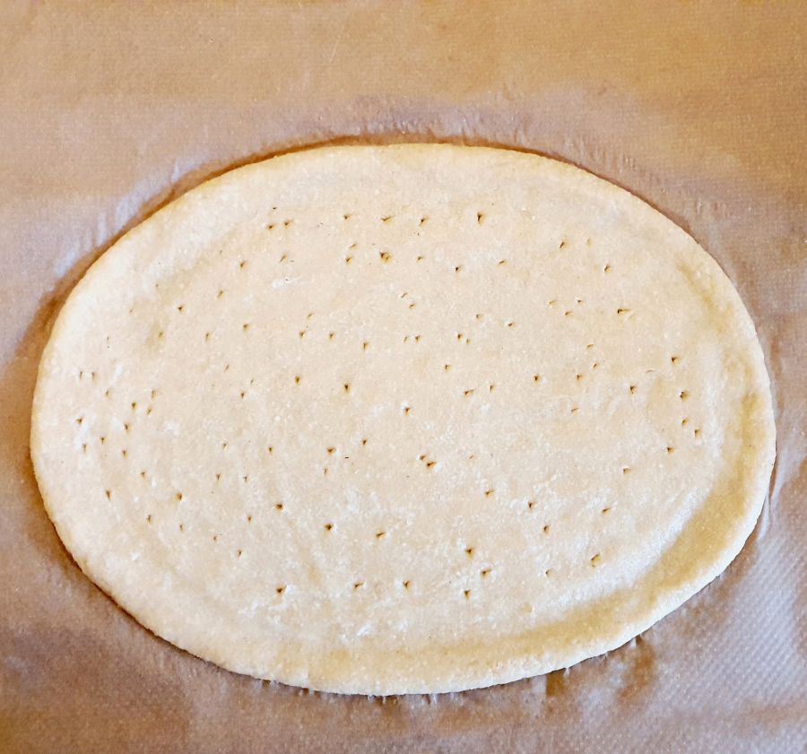 Mit Bambusfaser groß oval oder rund dünn ausrollen, den Rand etwas dicker lassen. Mit einer Gabel den Teig leicht einstechen.