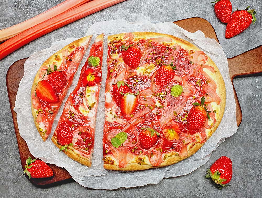 Den vorgebackenen Teig ca. 10 Minuten abkühlen lassen, dann mit Puddingcreme bestreichen, danach die Erdbeercreme unterziehen und zuletzt den Rhabarber auflegen.
