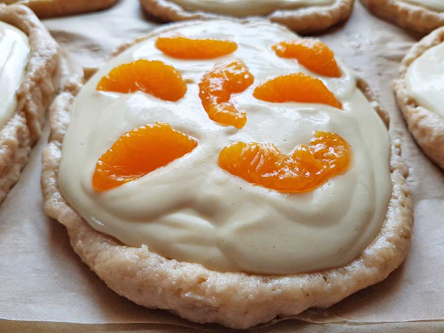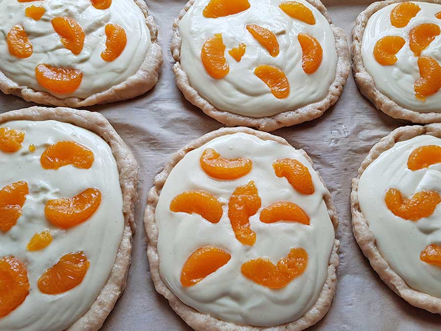 Die Pudding-Quark-Masse gleichmäßig in den Vertiefungen verteilen. Zum Schluss die Mandarin-Orangen abtropfen und die Teilchen damit verzieren.