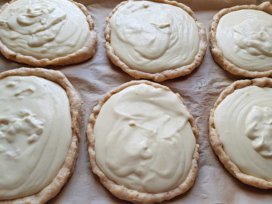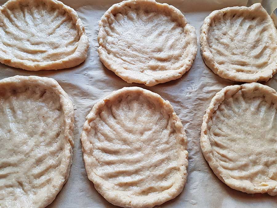 Den Teig in 6 Portionen teilen und auf ca. 20 x 16 cm ausrollen. Die Ränder sollten etwas dicker sein und die Mitte der Teilchen nur ca. 0.5 cm dünn, so dass der Teig nicht auslaufen kann.