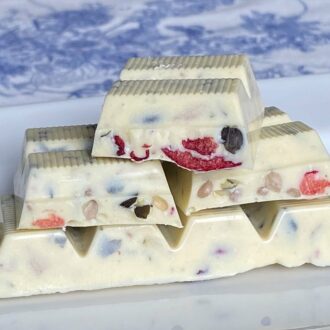 Schokoriegel mit gefriergetrockneten Früchten, Kürbis- und Sonnenblumenkernen. Pro 100g nur 8g Kohlenhydrate.