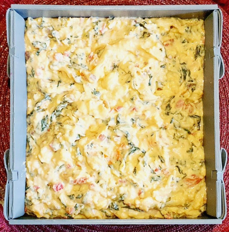 Die Masse auf den zweiten Teig gießen und mit dem Käse bestreuen. Die Backform einmal aufklopfen.