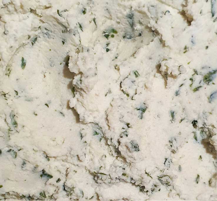 Für die Fülle Ricotta, Zitrusfaser, Schnittlauch und Gewürze mit einem Löffel gut miteinander vermengen. Die Masse in einen Spritzsack ohne Tülle füllen.