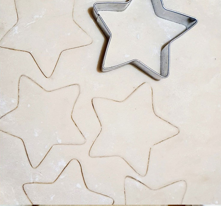 Backpapier auslegen, mit etwas Bambusfaser bestreuen und den Teig mit Hilfe von weiterer Bambusfaser dünn ausrollen. Ich hatte 3mm Teigstärke. Mit dem Ausstecher Sterne ausstechen.