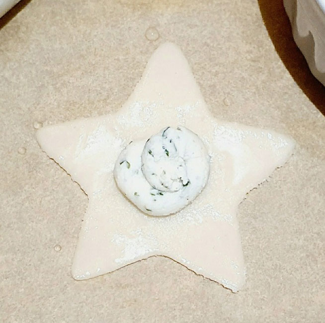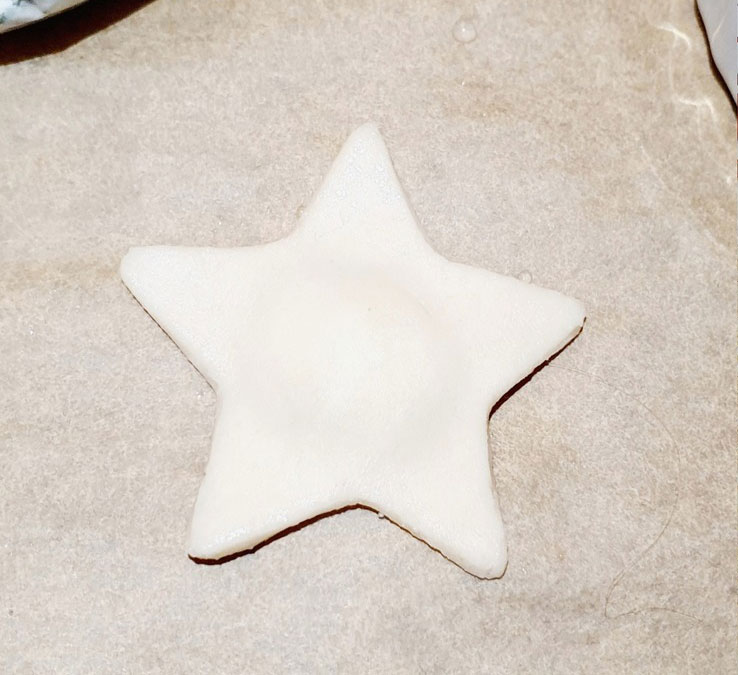 Den oberen Teil auch befeuchten und die Sterne zusammensetzen. Die Ränder gut zusammendrücken, und mit etwas Wasser und Fingern glatt streichen.