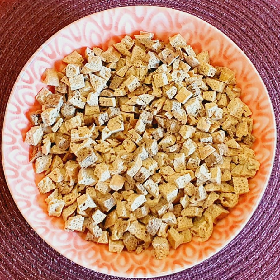 Milch und Butter erwärmen, die Hälfte des Gemüseliebling, etwas Salz hinzufügen und über die getrockneten Brotwürfel leeren. Gelegentlich umrühren und ziehen lassen.