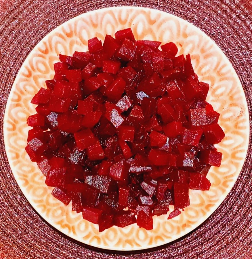 Die rote Rübe klein würfeln und in ein hohes Gefäß geben.