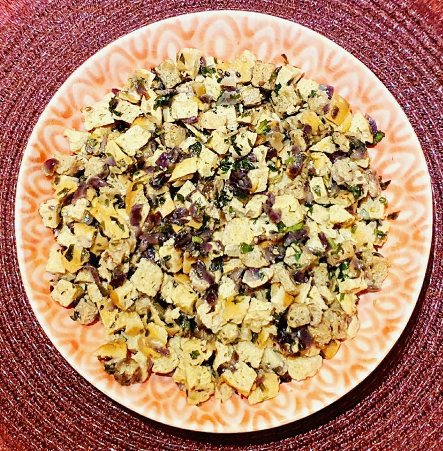 Die Zwiebel und Petersilien-Mischung mit den Brotwürfel vermengen.