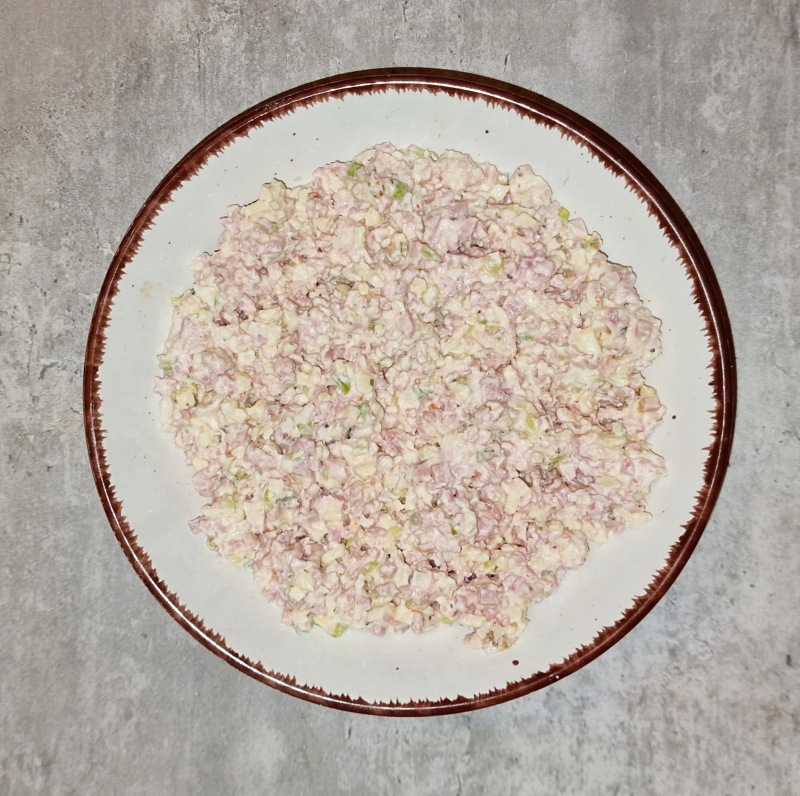 Schinken ganz klein schneiden oder in einem Multizerkleinerer hacken, Käse reiben oder auch im Multizerkleinerer zerkleinern, Frühlingszwiebel putzen und in kleine Würfel schneiden, Knoblauch pressen und alles in eine Schüssel füllen. Frischkäse, Creme Fraiche und Gewürze hinzufügen, alles gut durchrühren. Schüssel abdecken und im Kühlschrank etwas durchziehen lassen.