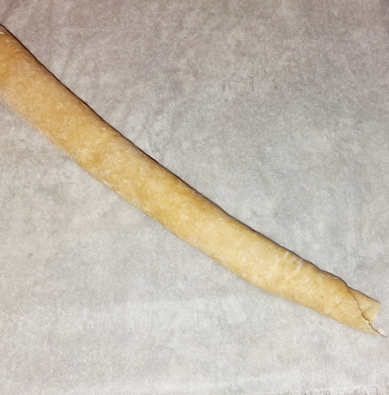 Einen Teigteil nehmen, mit feuchten Fingern zu einer Kugel drehen. Auf ein sehr gut mit Bambusfaser gestaubtes Backpapier setzen, die Kugel nochmals bestauben, mit Backpapier abdecken und zu einem länglichen Streifen ca. 35 x 14 cm ausrollen, dazwischen, wenn es nötig ist, leicht mit Bambusfaser bestauben. Den ausgerollten Teil abpinseln (Bambusfaser).