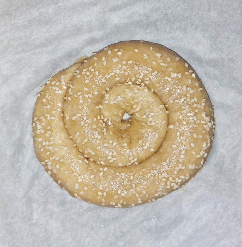 Wieder Bambusfaser so gut es geht abpinseln und mit etwas Wasser glatt streichen. Danach mit Sesam bestreuen, auf ein Backblech setzen und abdecken.