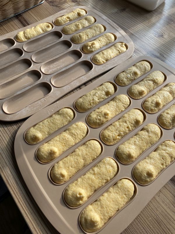 Die fertigen Löffelbiskuits aus der Form nehmen und abkühlen lassen.