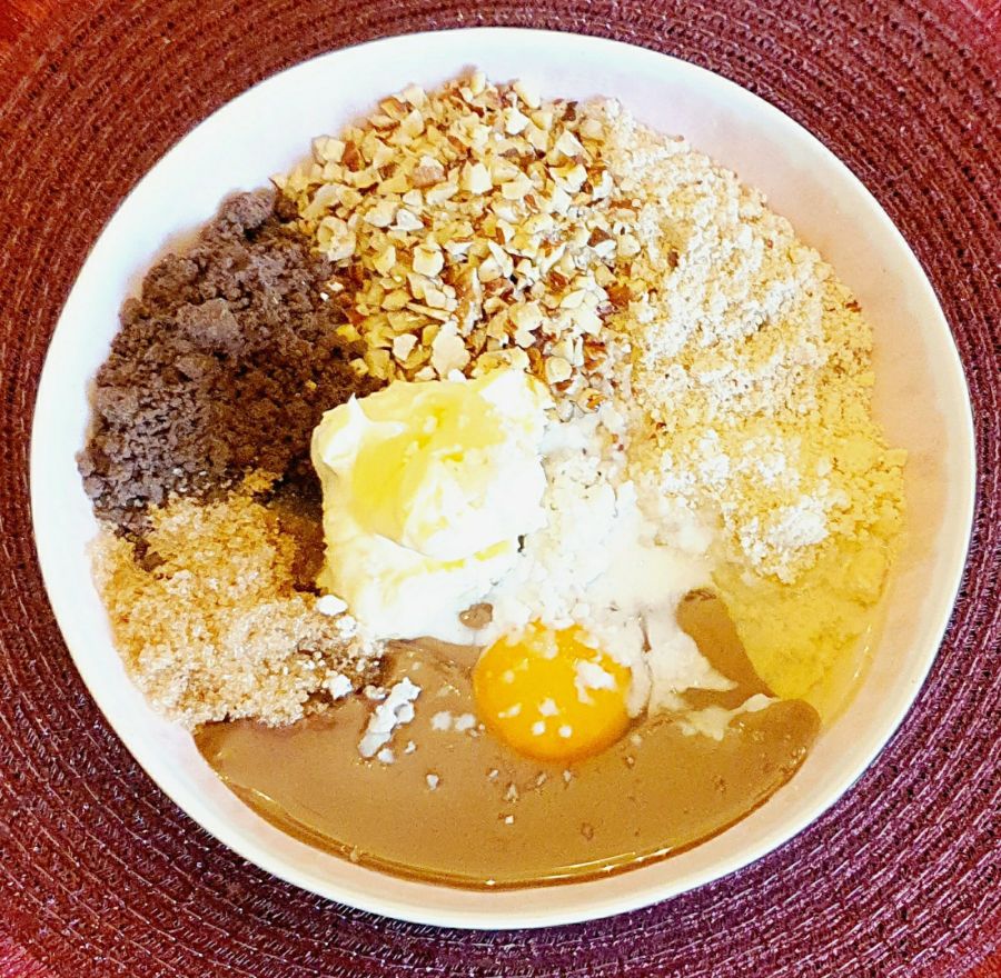 Aus Browniezauber, Nussplätzchen, Mandelstaub, Zitrusfaser, Karamelltraum, Süße, Haselnüssen, Ei, Nuketo, Butter, Pure Flavour und Salz einen Teig zubereiten.