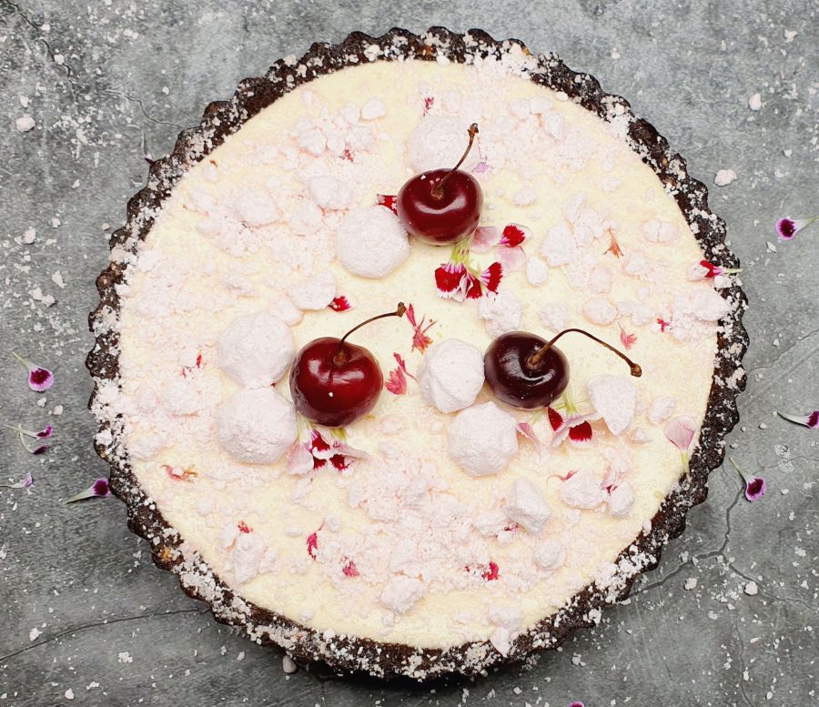 Zum Verzieren aus dem Kühlschrank nehmen, und mindestens 1 h (im Hochsommer reicht eine halbe Stunde) stehen lassen. Dann mit zerbrochenem Baiser und den Baisertupfen verzieren. Zusätzlich nach Belieben mit essbaren Blüten und Kirschen.