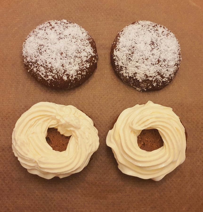 Wenn die Krapfen abgekühlt sind, durchschneiden, die Creme in einen Spritzsack mit Sterntülle füllen und am äußeren Rand einen Kreis spritzen. In der Mitte für die Kirschen frei lassen.