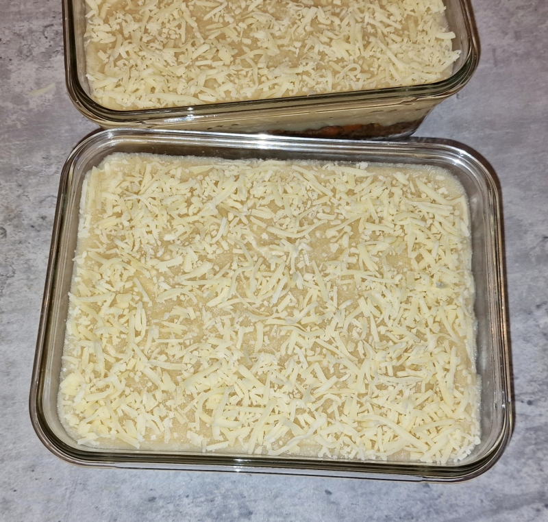 Die Hackfleischschicht in die Auflaufform füllen und mit einem Löffel glattstreichen. Dann das Püree darauf setzen, auch glattstreichen und mit dem restlichem geriebenen Gouda bestreuen.
