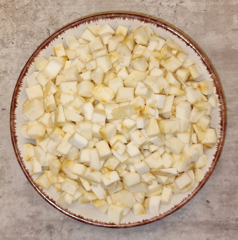 Fürs Püree Blumenkohl putzen und in kleine Röschen teilen. Sellerie von der Schale entfernen und in kleine Würfel schneiden. Blumenkohl und Sellerie in etwas gesalzenem Wasser weich kochen. Nach dem Kochen abseihen und abkühlen lassen.