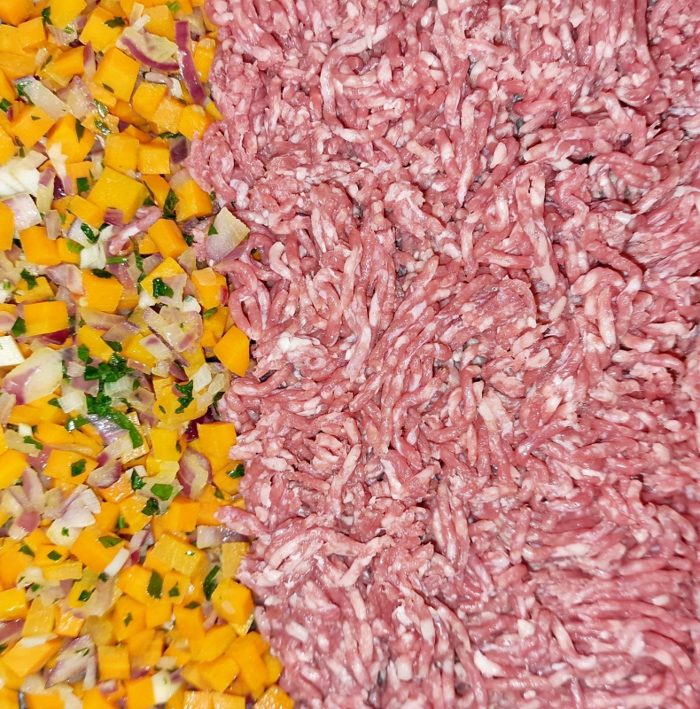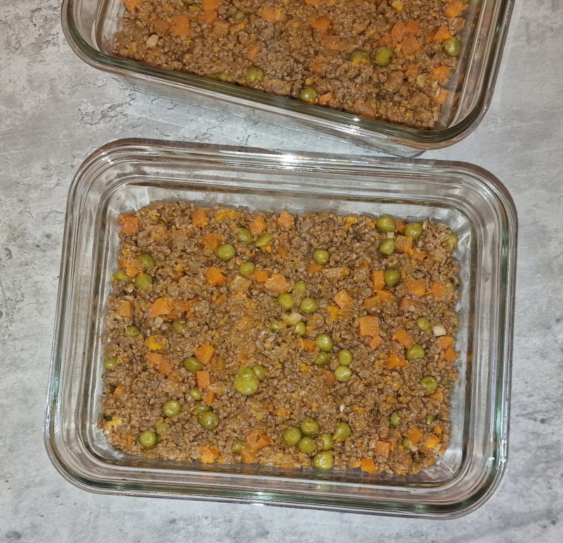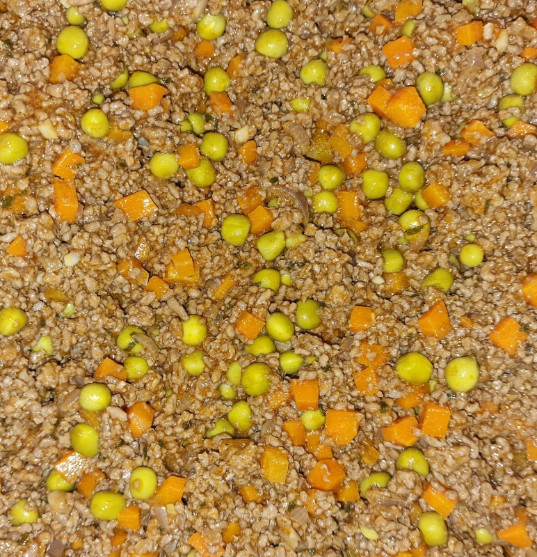 Für die Hackschicht Zwiebel und Petersilie fein schneiden, Karotten klein würfeln. In einem Topf Butterschmalz und Karamelltraum zum Schmelzen bringen, Zwiebel, Petersilie und Karotten etwas anbraten. Das Hackfleisch und Gemüseliebling hinzufügen und weiter anbraten. Tomatenmark, Majoran und Lorbeerblätter, Rotwein und Rinderbrühe hinzufügen und einkochen lassen. Wenn die Flüssigkeit zur Hälfte verkocht ist, die Erbsen hinzufügen (wenn TK Erbsen) und auf kleiner Flamme weiterkochen. Wenn Erbsen aus der Dose, erst nach dem Binden mit Suppentraum hinzufügen. Zum Schluß mit Suppentraum Harira & Tomate binden und etwas abkühlen lassen.