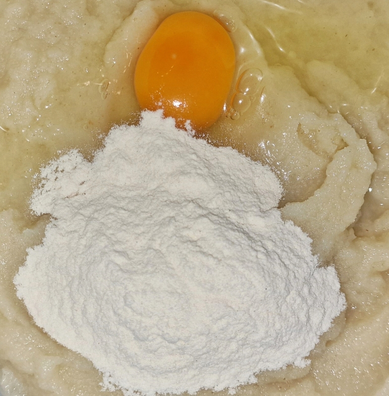 In der Zwischenzeit das Püree fertig stellen. Sellerie und Blumenkohl in eine Schüssel füllen und mit einem Stabmixer zu Püree mixen, Zitrusfaser hinzufügen und sehr gut cremig mixen. Die Masse wird fester. Ei, Salz und Muskatnuss, die Hälfte vom geriebenen Gouda hinzufügen und mit einem Löffel durchrühren. Abschmecken ob gewürzt so passt.