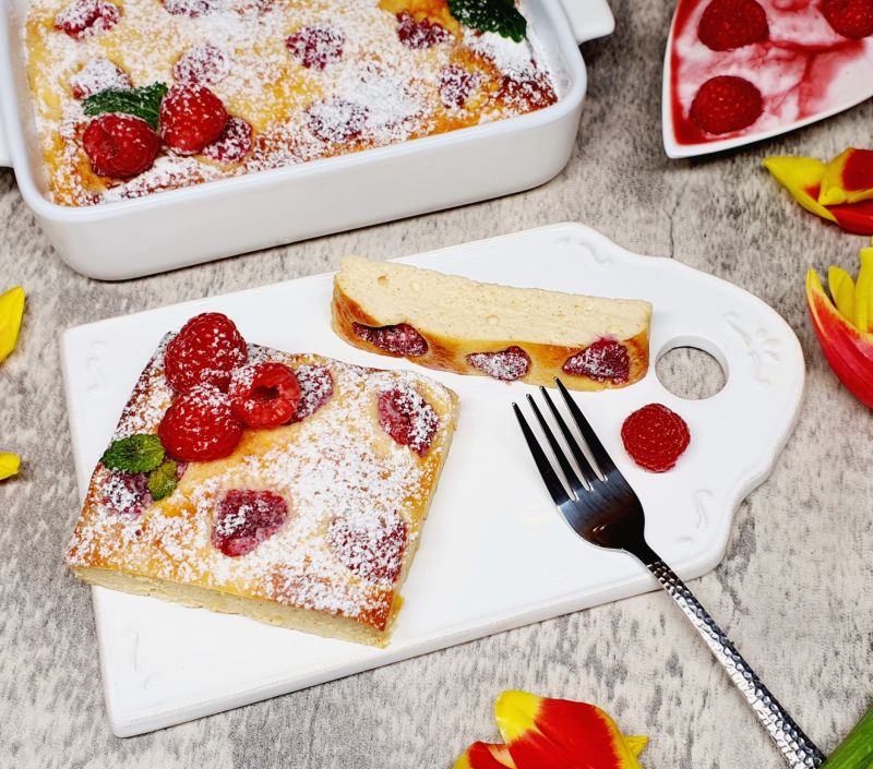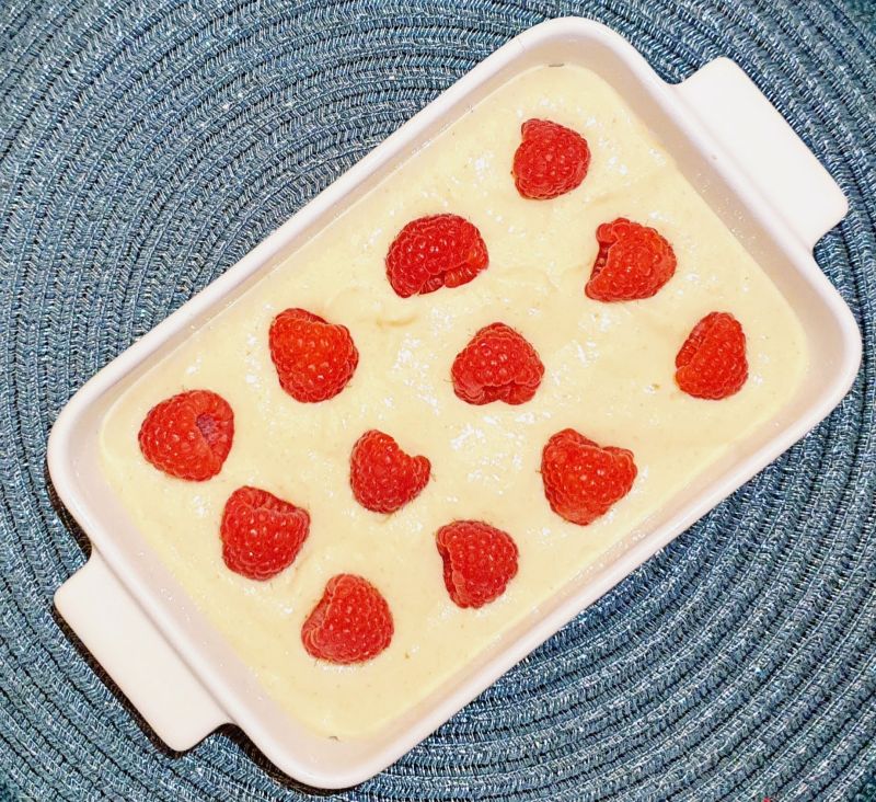 In eine Auflaufform gießen und 3/4 der Himbeeren in den Teig drücken.