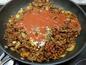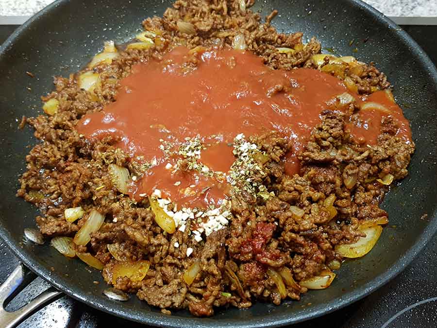 Die Zwiebeln kleinschneiden und zugeben, sobald vom Hackfleisch nur noch wenige rohe Stellen zu sehen sind. Den Knoblauch feinhacken und ebenfalls kurz mitbraten.