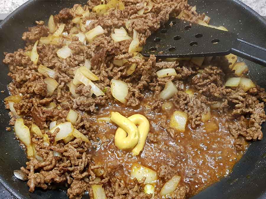 Wenn die Zwiebeln glasig und das Hackfleisch vollständig durchgebraten ist: mit Rotwein ablöschen und den Senf unterrühren. Ein paar Minuten schmoren lassen, das Tomatenmark zugeben und gut unterrühren.