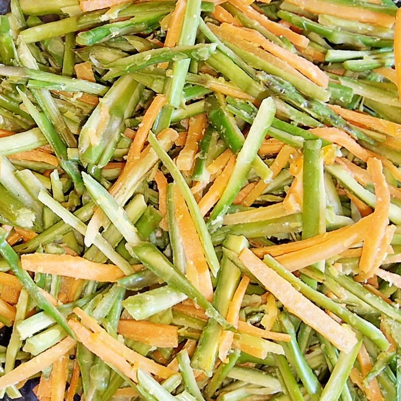 Für die Spargelrolle den Spargel und die Karotte in Stifte schneiden, in einer Pfanne Butterschmalz erhitzen und Spargel und Karottenstifte kurz anbraten. Zum Abkühlen zur Seite stellen.