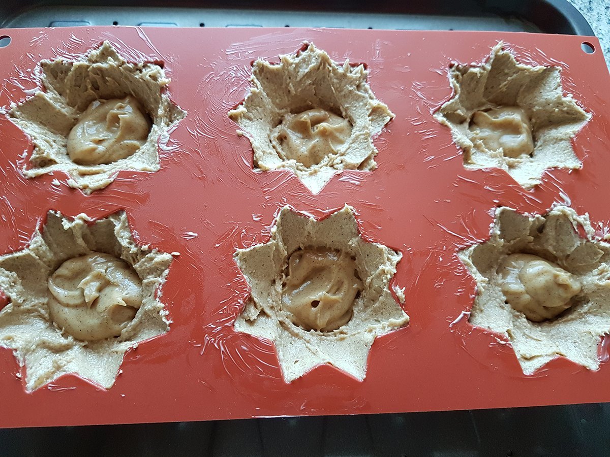 Nun mit einem Löffel einen Teil des Teiges aus der Mitte wieder herausnehmen und beiseite Stellen. Die Füllung gleichmäßig auf die Muffins verteilen und den beiseite gestellten Teig darüber verstreichen.