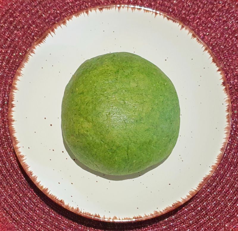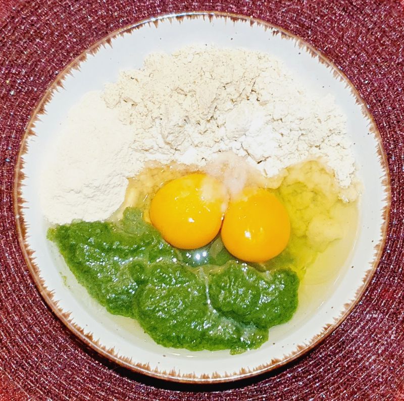 Alle Zutaten wie Spinat, Ei, Germknödelteig, Kuchenzauber, Zitrusfaser, weiche Butter, Salz und Gemüseliebling in eine Schüssel füllen und mit einem Löffel zu einem Teig vermischen.