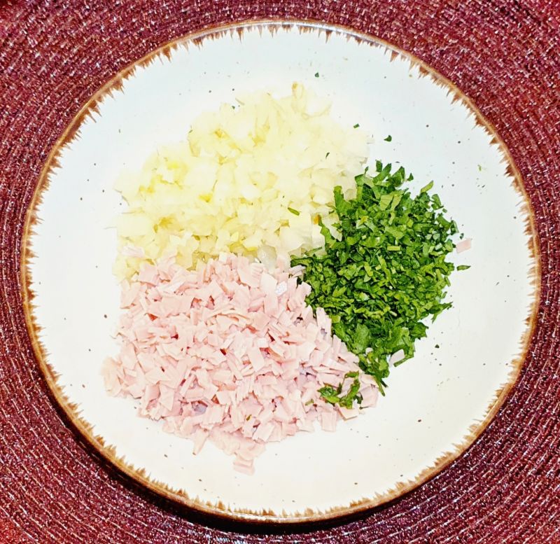 Zwiebel und Schinken klein würfeln, Petersilie fein hacken. In Ghee leicht anbraten, mit Sahne und Mandel Cuisine aufgießen, nach eigenem Geschmack würzen und unter Umrühren kurz aufkochen lassen.