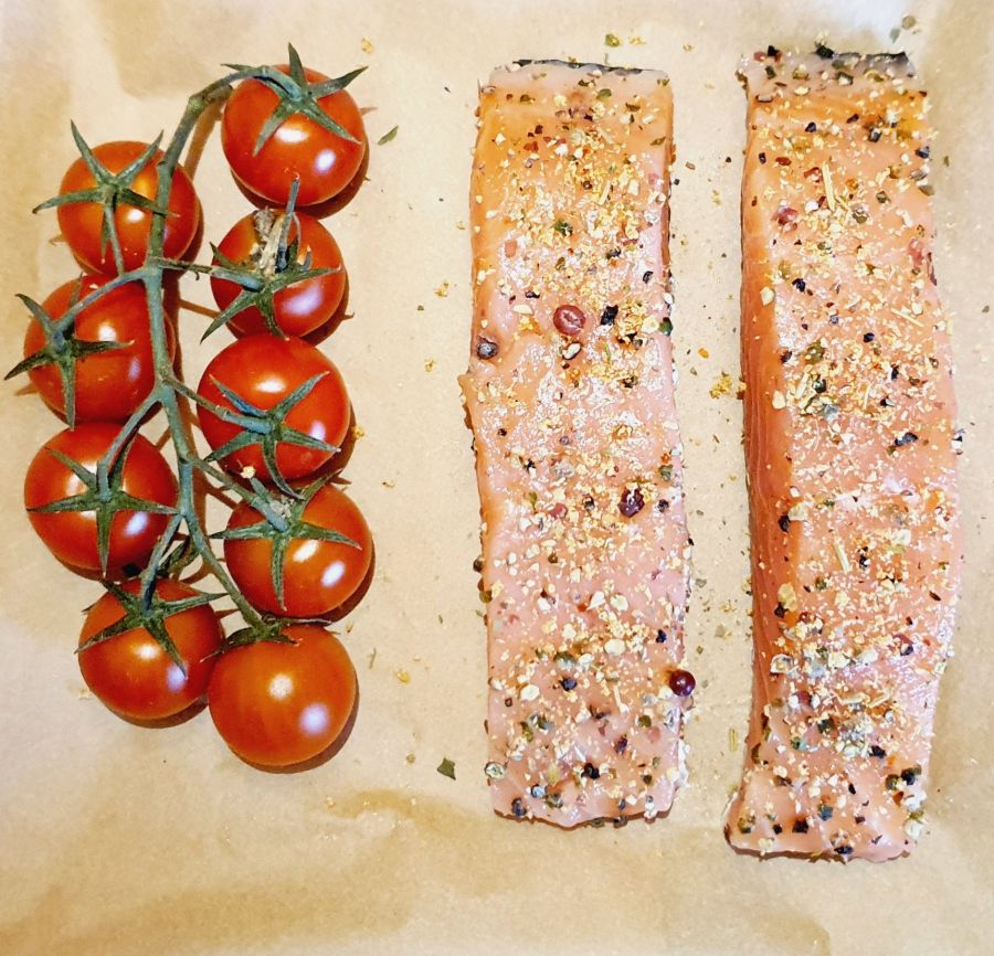 Backofen auf 140 Grad Umluft vorheizen. Lachsfilet waschen und trocken tupfen, mit Ghee bestreichen (kurz flüssig gemacht), mit der Pfeffermischung und Gemüseliebling würzen und auf ein Backpapier setzen. Die Strauchtomaten dazulegen und für 18 - 20 Minuten im Backrohr lassen.