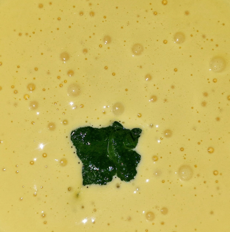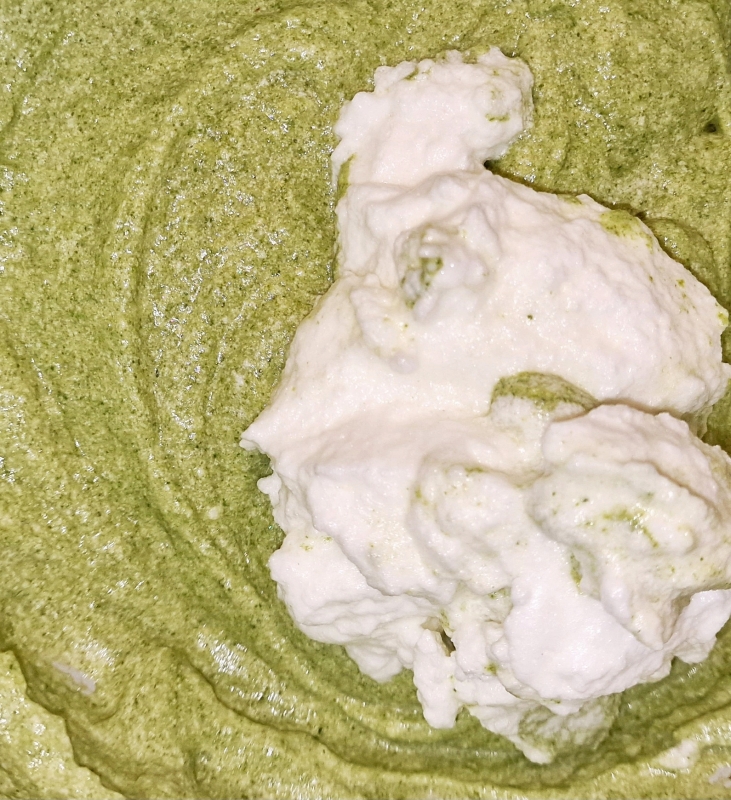 Den erwärmten Cremespinat in das schaumig angeschlagenen Eigelb mixen, dann löffelweise den Mandelstaub einrühren und zuletzt den steif geschlagenen Eischnee unterheben.