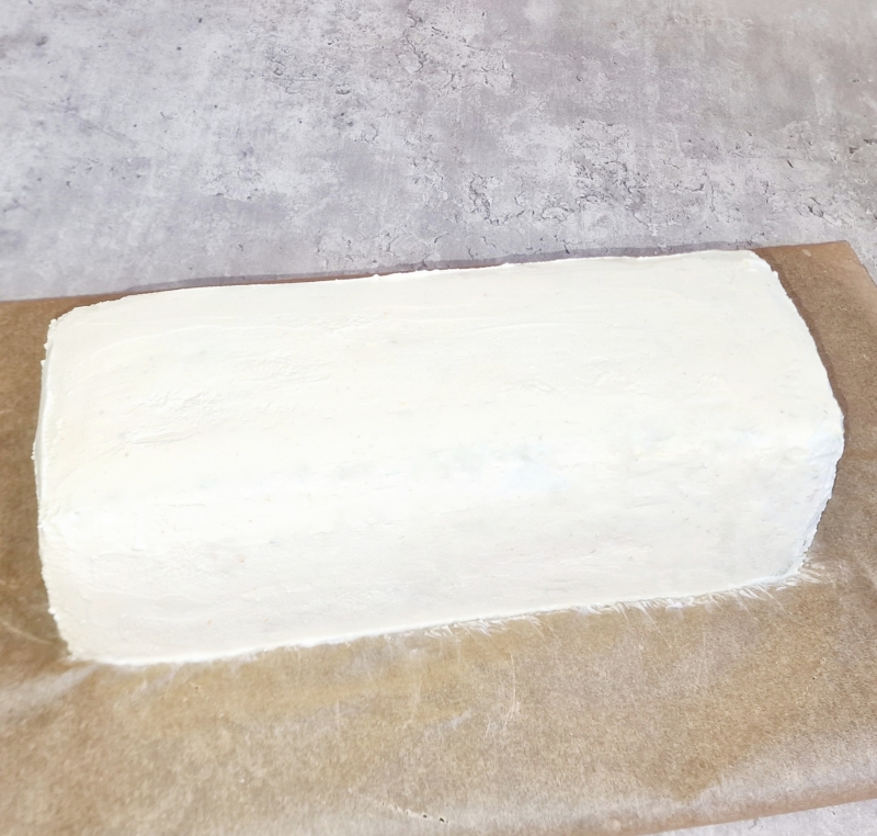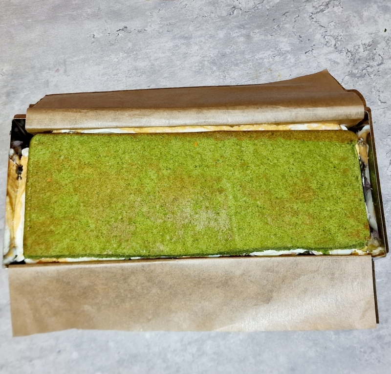 Zum Zusammenbauen empfehle ich eine längliche Backform oder Backrahmen, den man mit Backpapier auslegt.