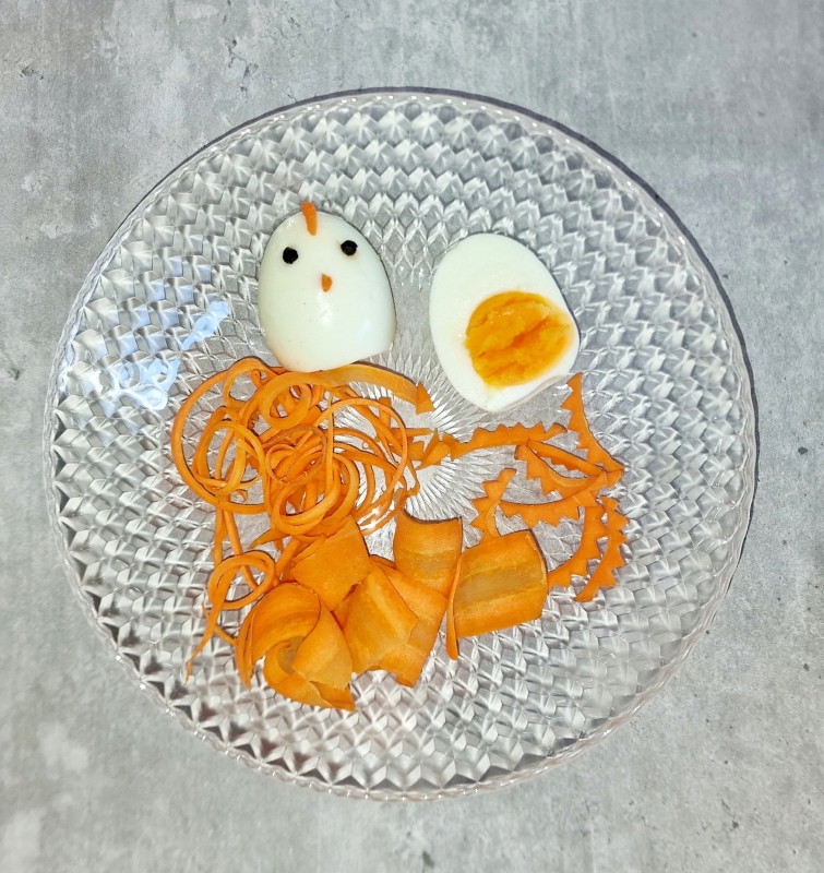Für die Gockel die Eier halbieren. Aus Karotten einen Kamm und Schnabel schneiden. Für die Augen mit einer dünnen Messerspitze kleine Kreuze machen und die Pfefferkörner und Schnabel in die Kreuze stecken. Für den Kamm ein schmales Dreieck einschneiden und den Kamm aufsetzen. Mit etwas Frischkäse an den Rand der Schnitte setzen.